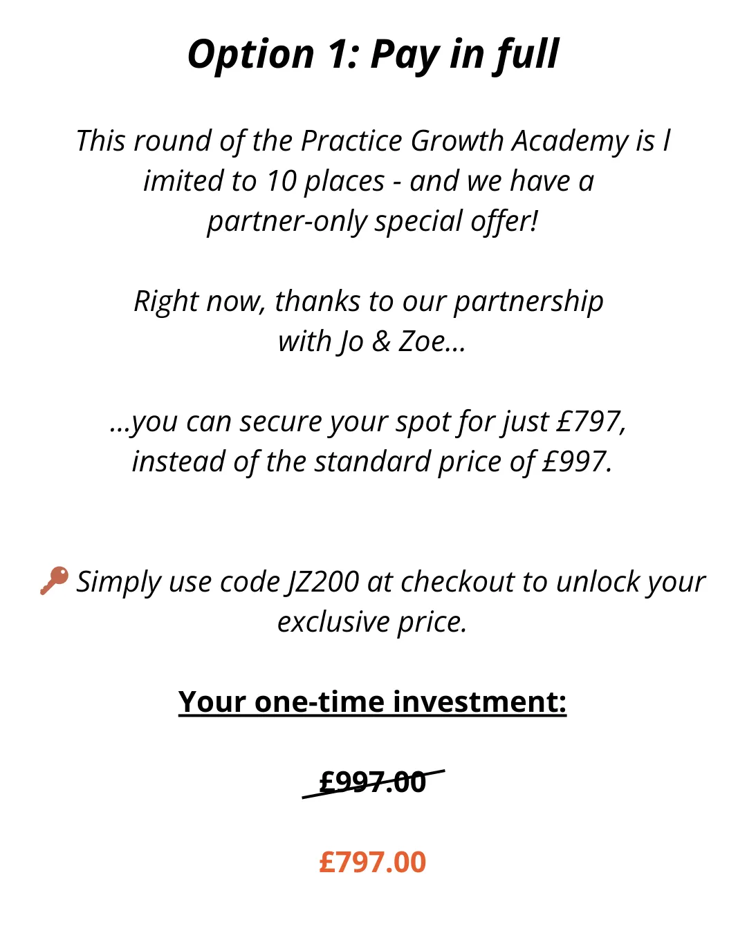 On the checkout page, enter code JZ200 where it says ‘Coupon code’. Your price will update to £797 automatically. This code is exclusive to Jo & Zoe's audience, limited to 10 people, and expires 25th January, 2026.